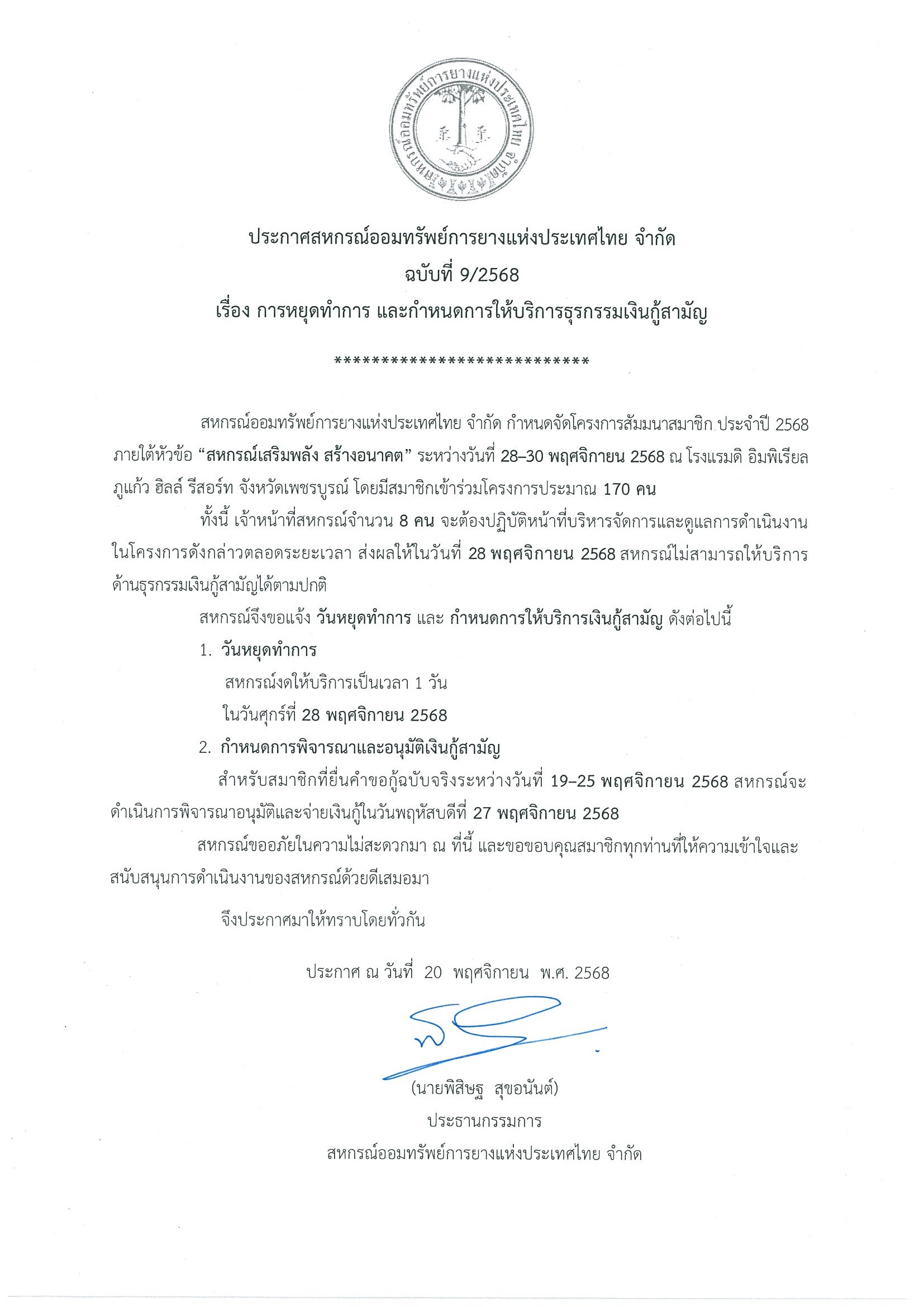 ประกาศ สหกรณ์ เรื่อง หยุดทำการ และกำหนดการให้บริการเงินกู้สามัญ